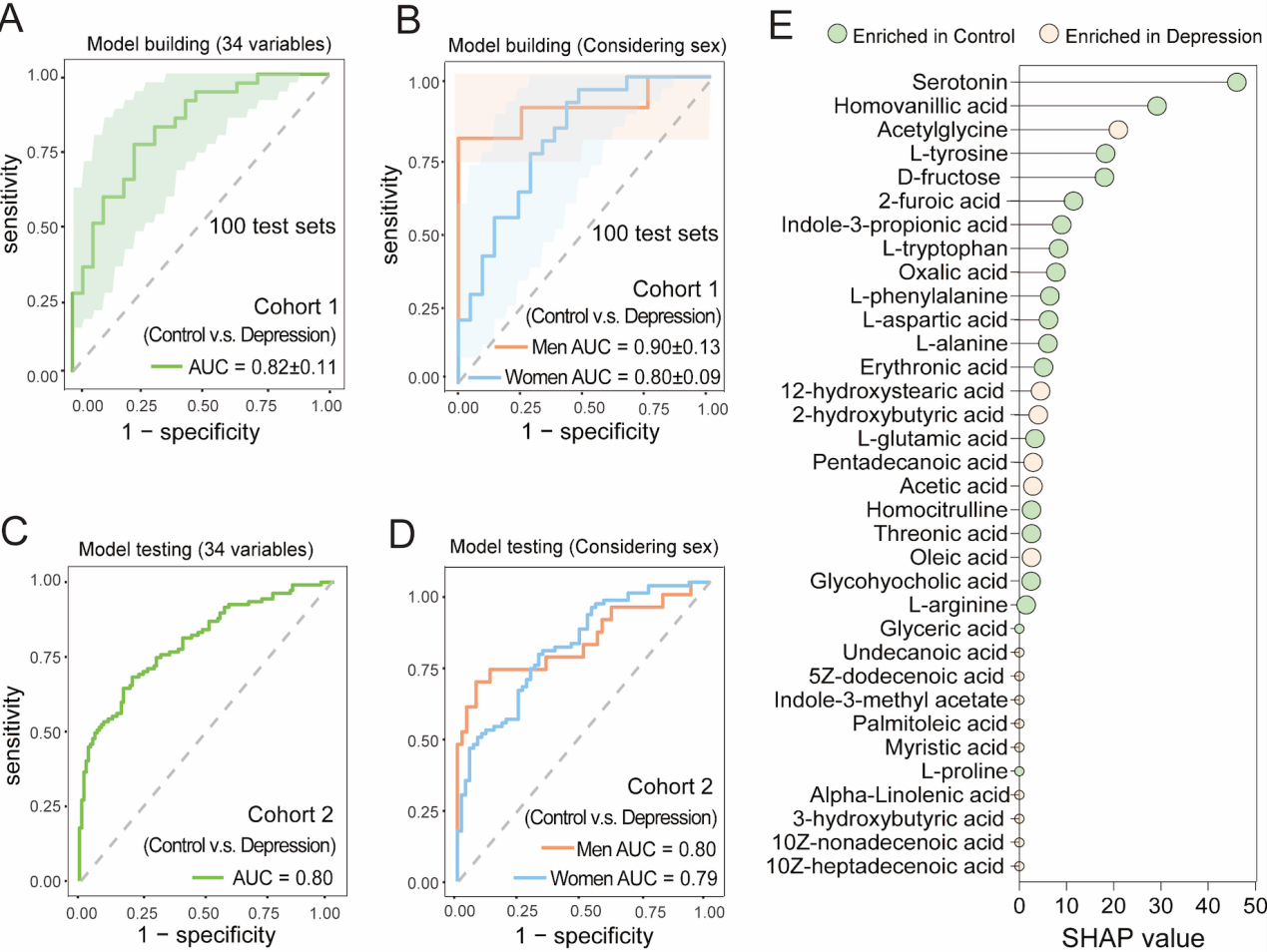 基于上述发现的34种差异代谢物,研究团队利用Gradient Boosting Machine算法构建了抑郁症诊断模型。首诊队列的测试集,该模型的受试者工作特征曲线下面积(AUC)达0.82,表现出优异的区分能力。在独立的验证队列中,模型AUC仍保持在0.80,具有良好的稳定性。